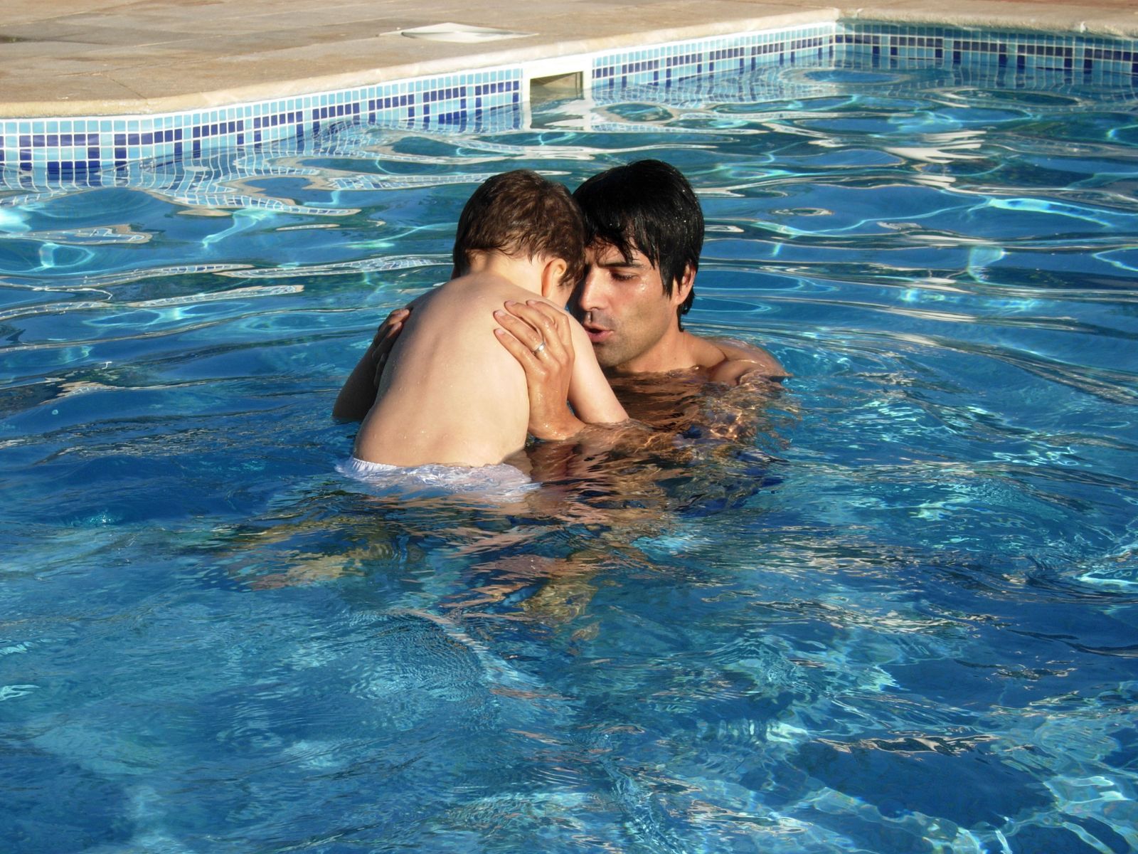 Nós dois estávamos tremendo, mas continuei falando com ele, dizendo que devemos respeitar a água, que às vezes pode assustar. Eu o abraçava firmemente, andando dentro da piscina. Uns dois minutos depois, o susto tinha passado e ele começou a brincar novamente.